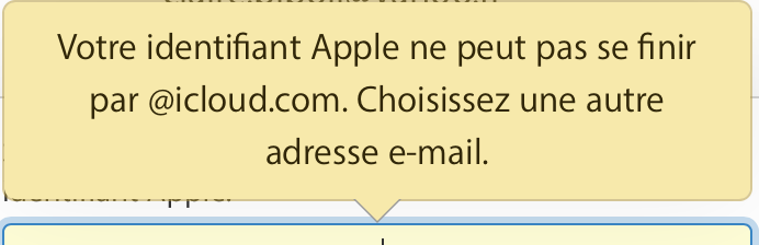 Ensuite, lorsqu'on a un compte iCloud avec en identifiant une adresse yahoo (par exemple), il n'est pas possible de changer son identifiant avec un adresse iCloud.com ou me.com. C'est une limite qu'Apple met en place dont je ne comprends pas l'intérêt véritable mais qui est incontournable.