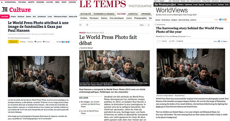 Photoshop a permis une chose formidable. Tout le monde trouve aujourd'hui les images suspectes. Or l'image photographique implique un point de vue particulier. Photoshop permet de faire plus vite et plus facilement ce que l'on a toujours pu faire et que l'on devait faire de manière obligatoire au tout début de la photographie. La technique ne permettait l'enregistrement que d'une toute petite partie de gamme lumineuse sur un même cliché. Il fallait "maquiller" ce défaut. Par exemple, les ciels étaient peints sur les photographies. Si on prend la photographie du WorldPress de cette année, il suffit de la basculer en niveau de gris pour voir que les techniques utilisées sont extrêmement classiques en Noir et Blanc. Photoshop permet de faire avec la couleur ce qu'il était aussi facile de faire avec le Noir et Blanc argentique. Cette photo s'inscrit naturellement dans un courant du photojournaliste qui remonte à Cartier-Bresson, Brassaï, Kertész et plus récemment, Nachtwey.