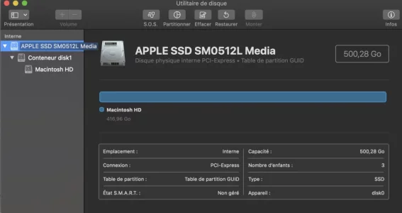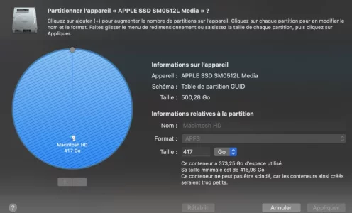 J'ai acheté un MacBook 15" de 2019 et la partition me semble vraiment étrange. Je n'arrive pas à accéder à la totalité du stockage disponible (500G).