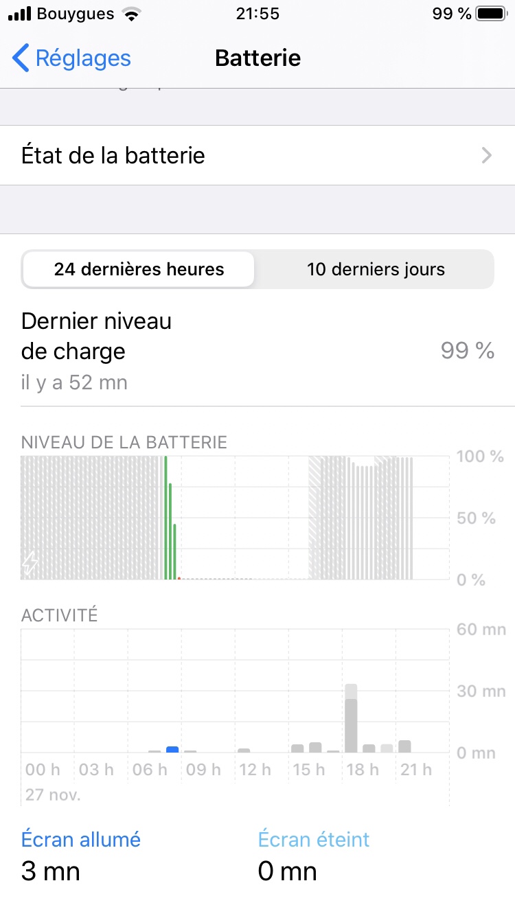 Hello, l’iPhone 7 de ma fille sous IOS13.1.3 a perdu pratiquement 98% de batterie en qq minutes comme le montre la capture d’écran.